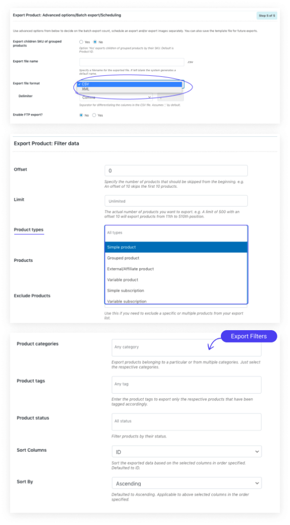 Export and download product data of different WooCommerce product types in CSV/XML file format.