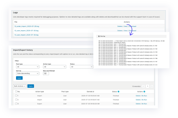 History: Lists the runs and the status corresponding to every import/export with options to re-run, view a detailed log or delete an entry. Re-run action will take the user to the respective screen depending on the corresponding action type and the user can initiate the process accordingly.
